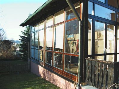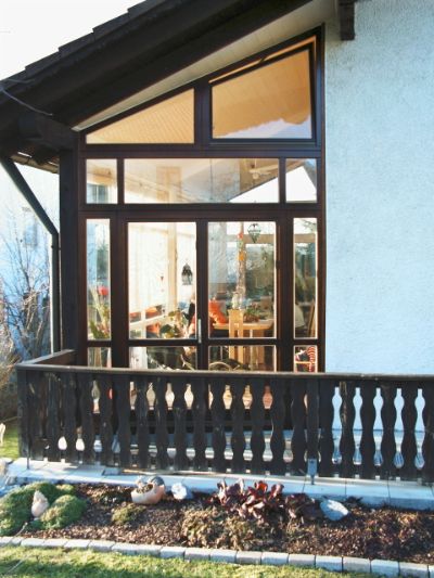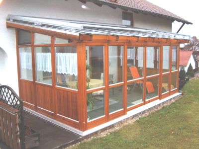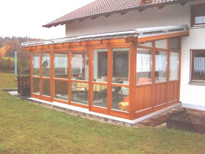 Wintergarten aus Lärche auf einer bestehenden Terrasse montiert. Die Oberfläche wurde außen Lassur Nußbaum und Innen Wachs weiß.